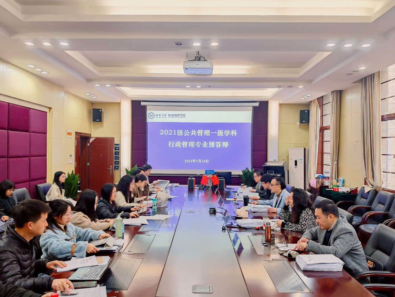 发布时间: 2024-03-18 10:35:45 已阅读:为确保2021级全日制学术型硕士学位论文质量,3月14日,学院组织了行政管理专业的硕士研究生学位论文预答辩工作。本次预答辩在公共管理一级学科指导下,由行政管理专业负责人王斌教授担任预答辩主席,吴江教授、诸彦含教授、张明教授、杨毅教授任预答辩委员。2021级13名研究生逐一汇报论文,2022级与2023级行政管理专业研究生参加学习。