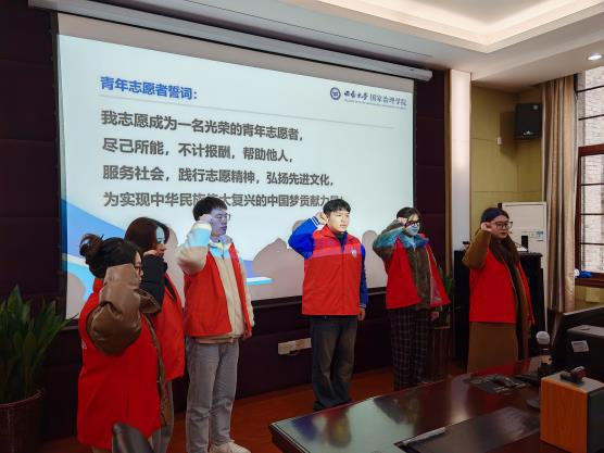 最后,刘勇书记和何健副经理为志愿服务团授旗,志愿服务团成员刘娜同学带领全体志愿者进行了宣誓。铮铮誓言,表达了志愿服务团的同学们致力于充分发挥专业优势,助力乡村振兴的决心和信心。