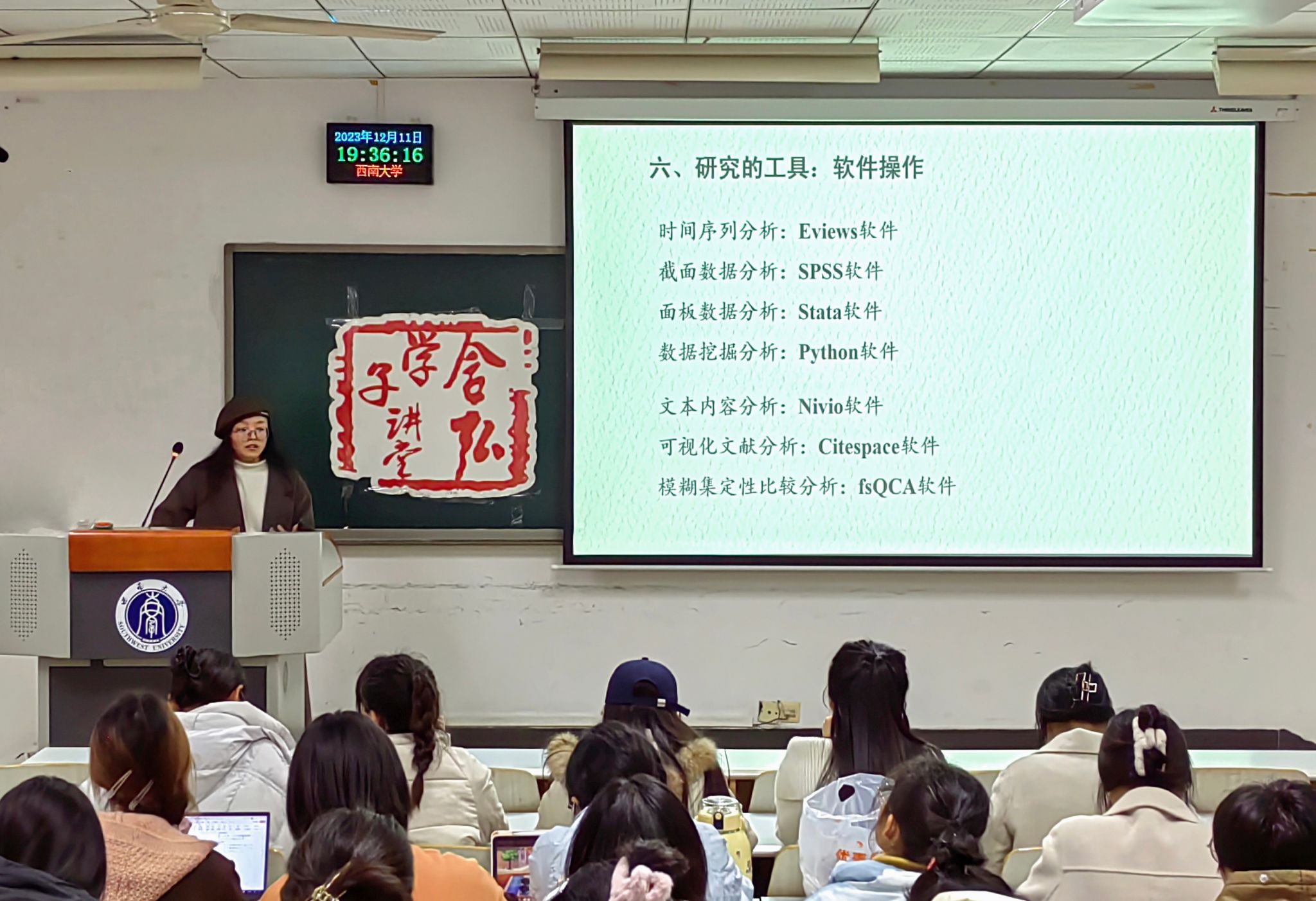 杜盼盼围绕定量研究的基本范式与Stata的基本操作,以当下的热点话题作为案例,引入了对基本范式、变量提炼、数据获取、模型建构、方法选择、软件操作的经验分享。期间,杜盼盼为现场的同学解答了数据处理中的赋值问题。