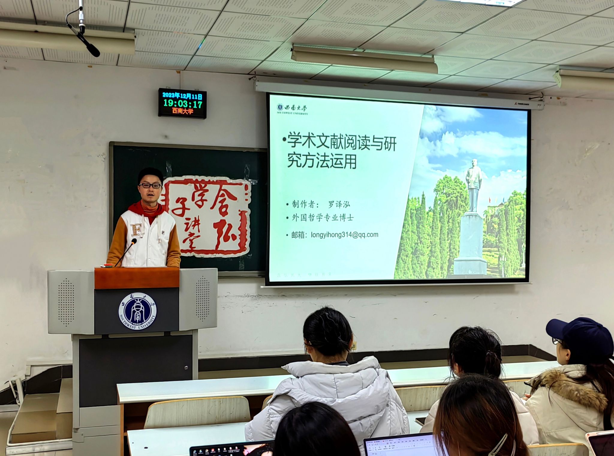 发布时间: 2023-12-14 16:54:40 已阅读:12月11日晚,由333体育官网研究生会主办,333体育研究生会承办的含弘学子讲堂之“绩镛国治论坛”于十教502教室顺利举办。本次“绩镛国治论坛”以“学术文献阅读与研究方法运用”为主题,邀请333体育2021级外国哲学专业博士研究生罗译泓与2022级社会保障专业硕士研究生杜盼盼围绕文献选择与阅读、方法学习与运用等主题进行经验分享,2023级全体研究生参与了此次讲座。