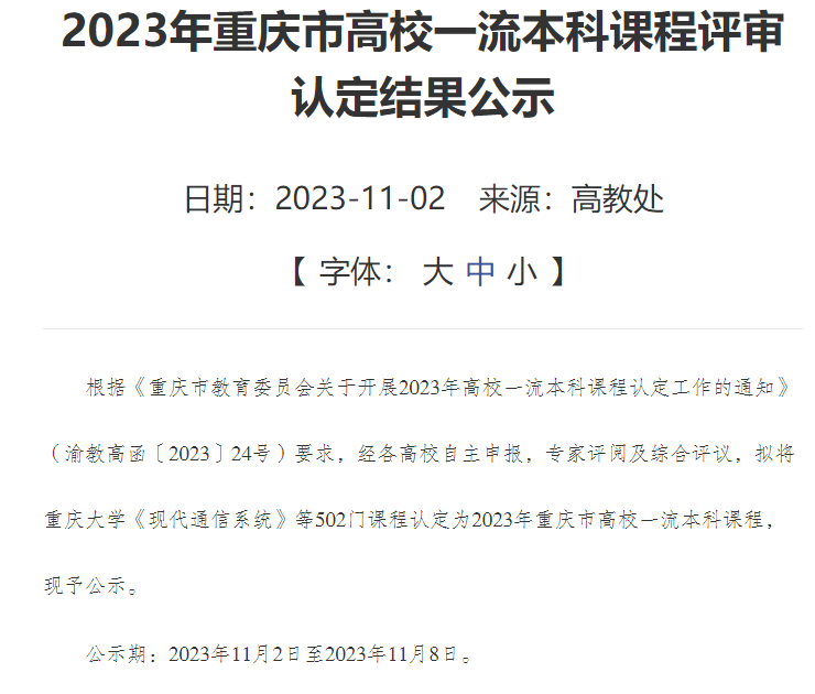发布时间: 2023-11-03 14:31:45 已阅读:11月2日,重庆市教育委员会发布《2023年重庆市高校一流本科课程评审认定结果公示》,学院2门课程列入2023年重庆市高校一流本科课程认定名单。其中,《组织行为学》被认为重庆市高校一流本科课程线下课程,《文化产业政策与法规》被认定为重庆市高校一流本科课程社会实践课程。