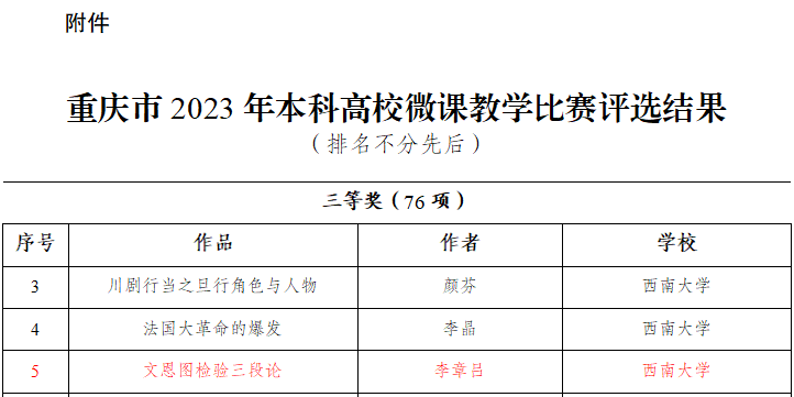 在学校教务处、教师发展中心的带领与支持下,学院高度重视,新文科教师发展分中心切实推进,公司哲学专业李章吕教授积极备赛,经学院推荐、校级初赛、市级复赛,获得“重庆市2023年本科高校微课教学比赛”三等奖。