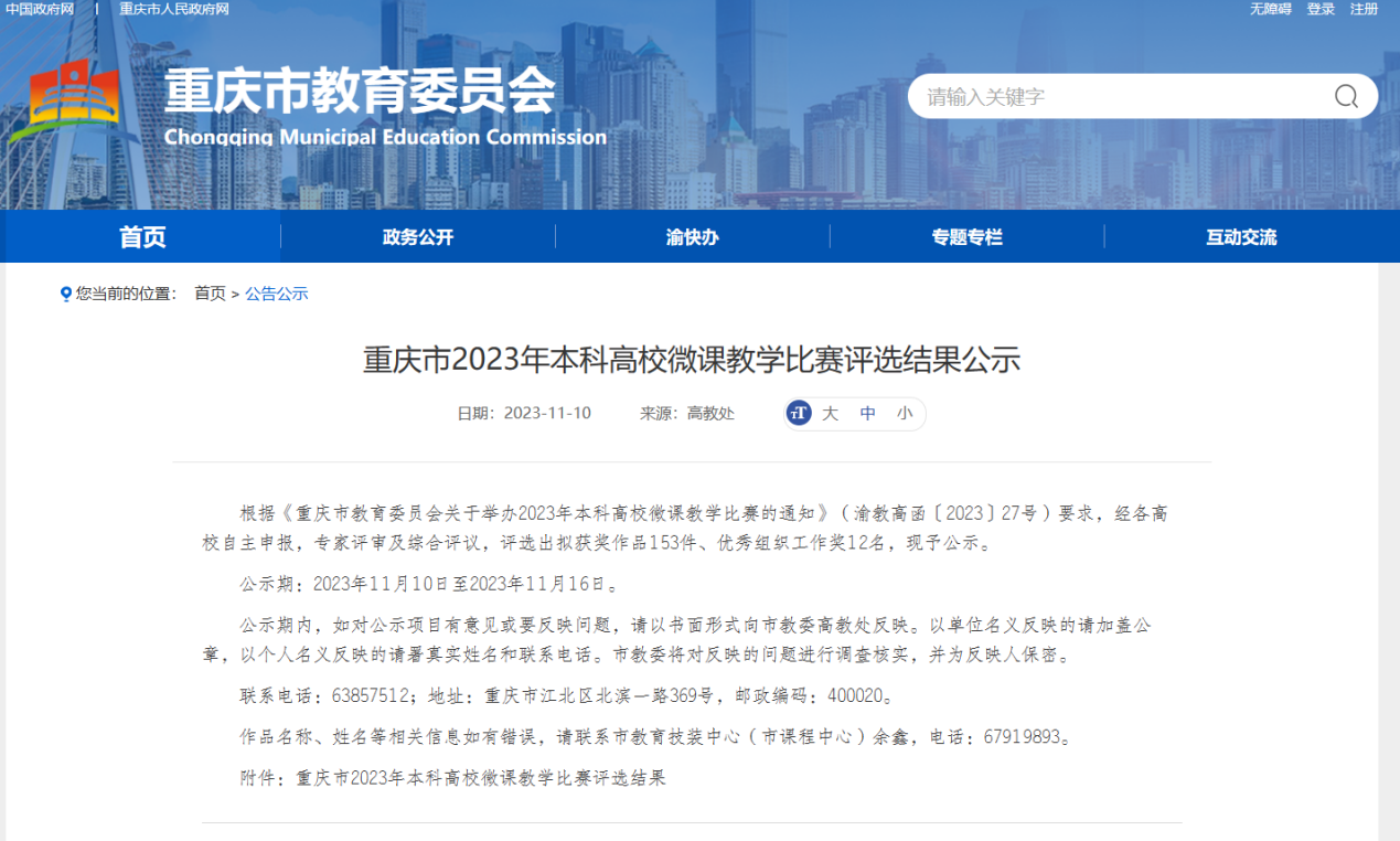 发布时间: 2023-11-13 10:56:52 已阅读:为深入贯彻习近平总书记关于教育的重要论述,落实教育数字化战略部署,充分利用信息技术开展人才培养模式和教学方法改革,进一步提升高校教师数字化教学能力,推动建设高质量教育体系,重庆市教育委员会组织开展了“重庆市2023年本科高校微课教学比赛”。