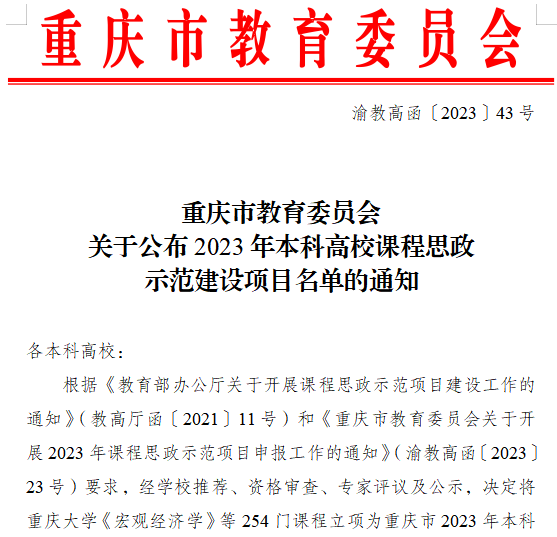 公司1门课程获重庆市本科高校课程思政示范建设项目