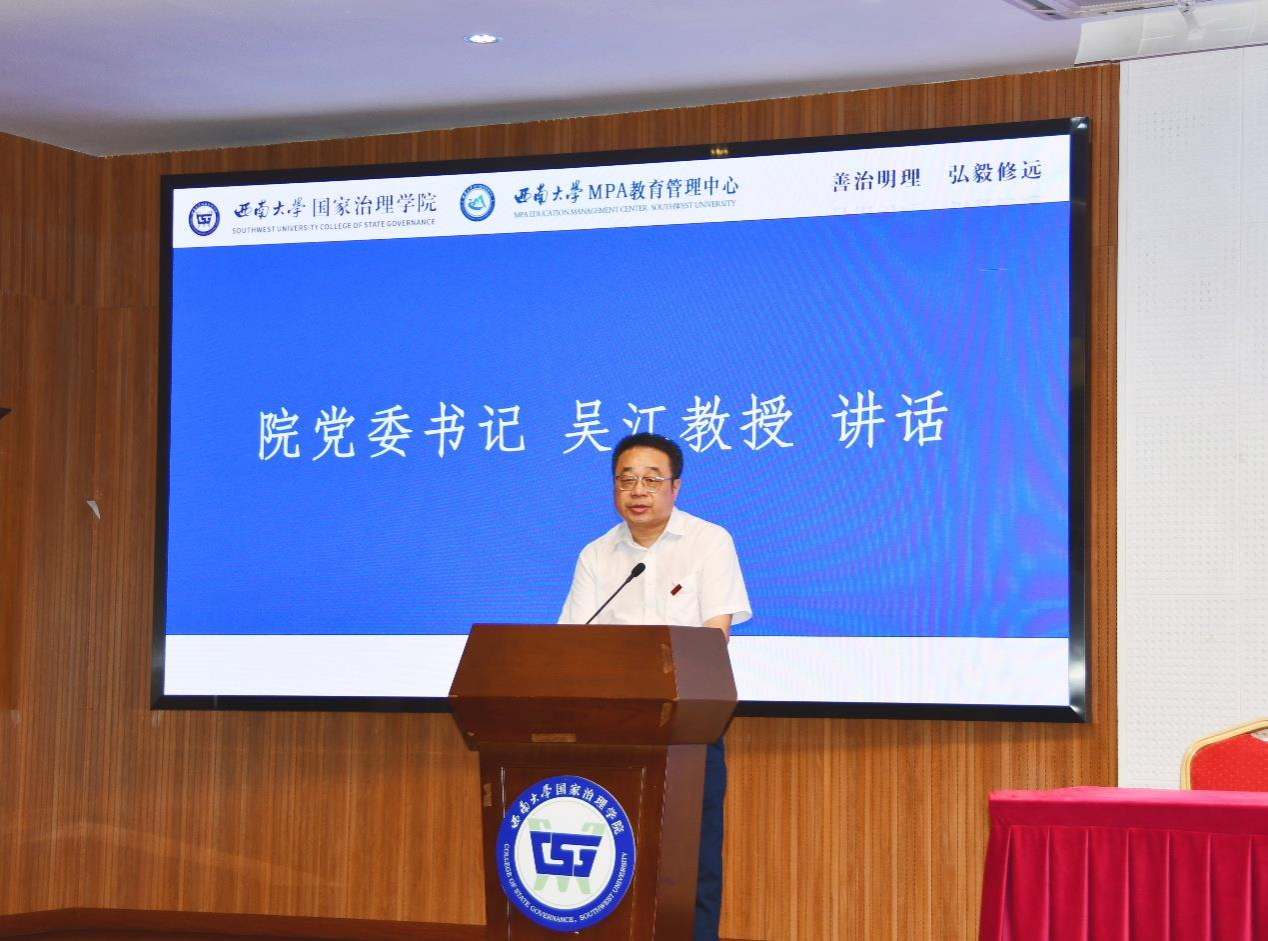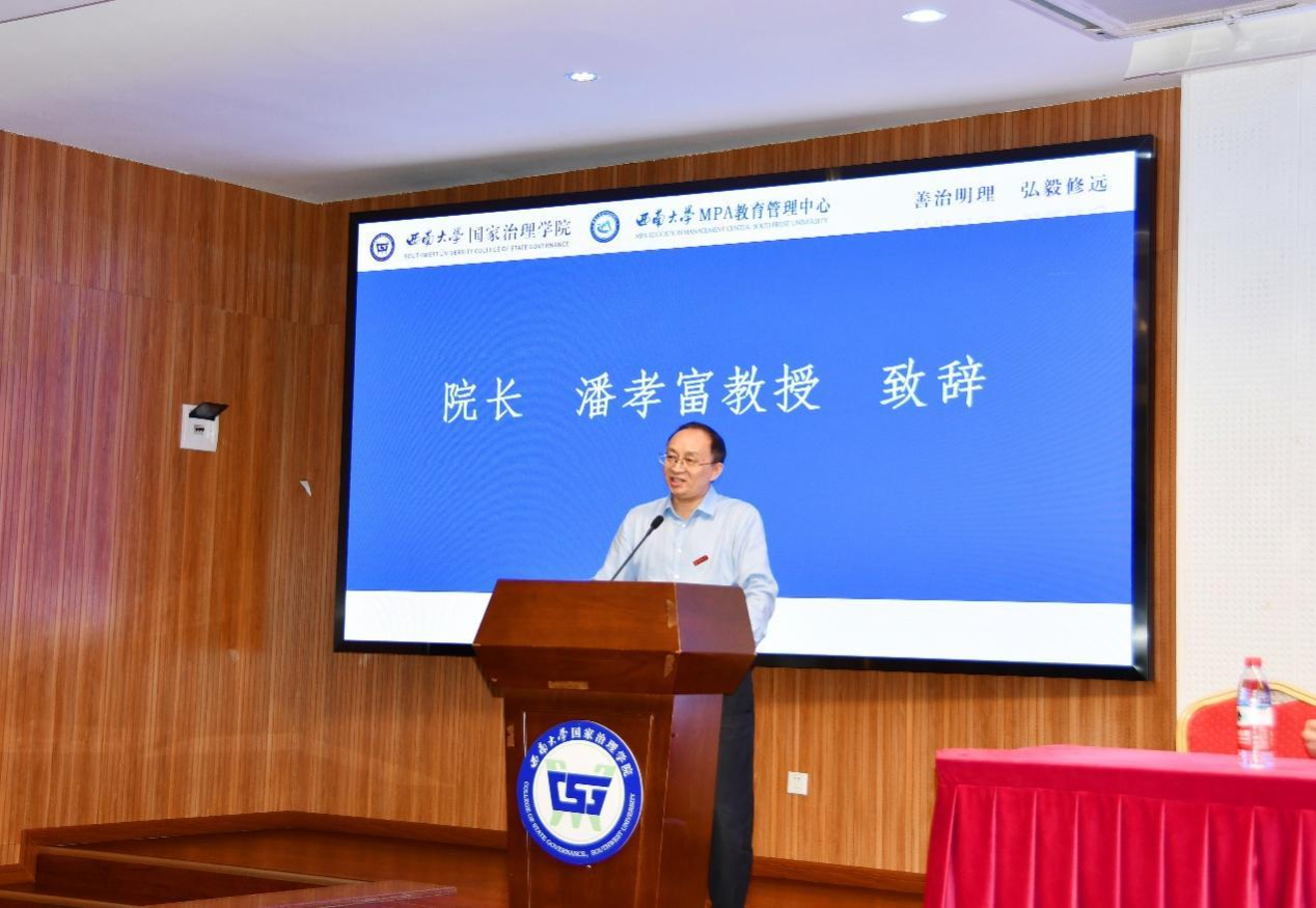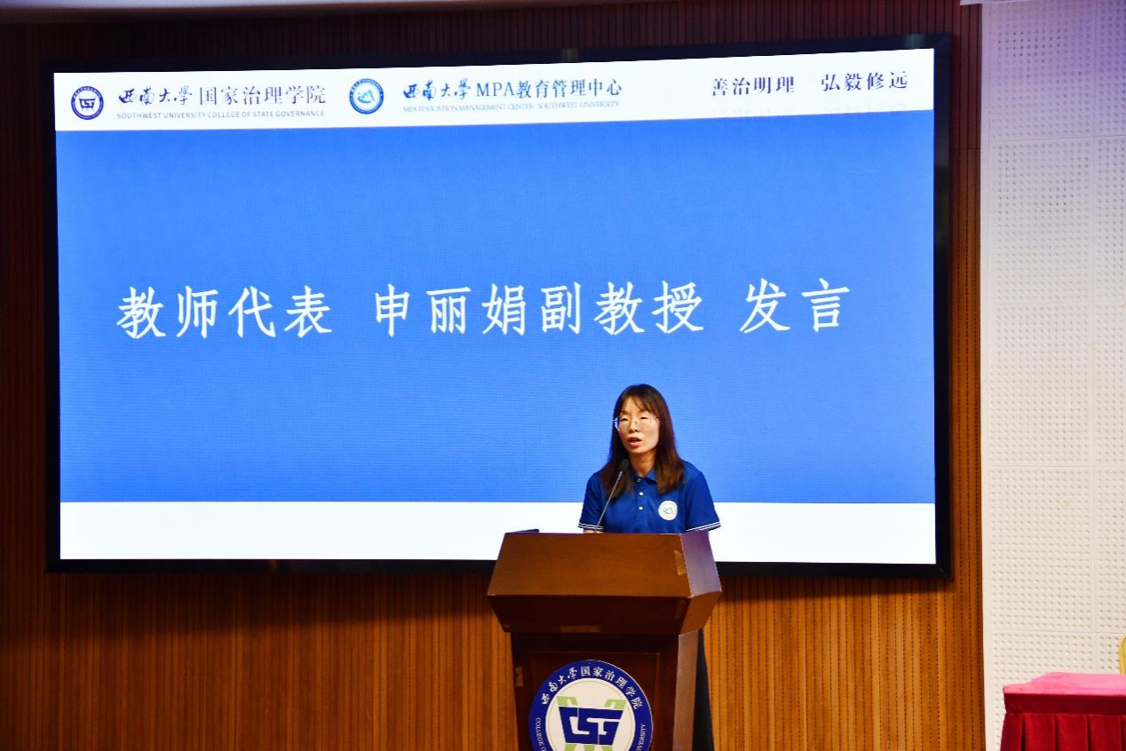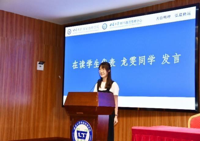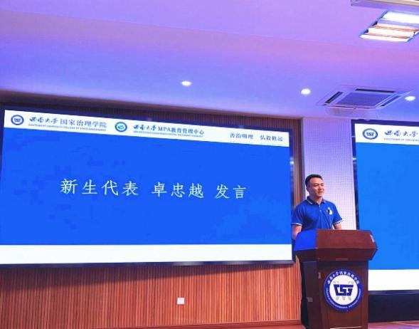 随后,2022级MPA在读员工代表龙雯同学、2023级MPA新生代表卓忠越同学依次发言。龙雯同学作为学习委员,分享了在校学习经验,启迪大家平衡好工作与学习的关系、把握好学习的节奏。卓忠越同学阔别学校16年,再次踏入熟悉的西大校园,他鼓励大家永葆“初心不与年俱老,奋斗永似少年时”的朝气,做虚怀若谷、竞争友爱的向上青年。