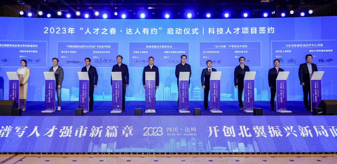 发布时间: 2023-04-25 16:17:21 已阅读:4月24日,2023年“人才之春·达人有约”启动仪式在达州举行。四川省委组织部、省科技厅,上海交通大学、四川大学、中国社会科学院大学、333体育官网等高校,亚洲财富论坛、北京蓝天阳投资管理有限公司等企业代表,达州市委、市政府,各县(市、区)、各高校、各市级部门、人才代表也参加本次启动仪式。学院受邀参加启动仪式并与万源市人民政府签订院地战略合作框架协议,学院副经理何健代表学院参加合作协议签字仪式。