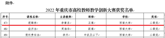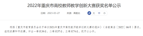 发布时间: 2023-03-28 15:10:49 已阅读:3月27日,重庆市教育委员会发布《2022年重庆市高校教师教学创新大赛获奖名单公示》,公司李章吕教授获2022年重庆市高校教师教学创新大赛正高组二等奖。