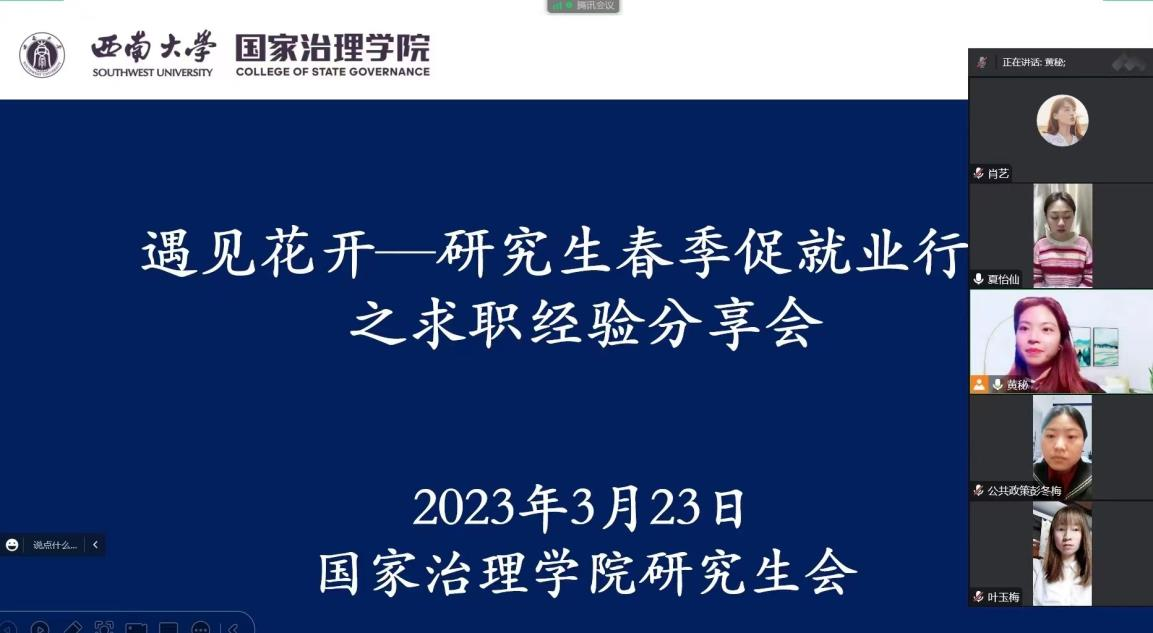 发布时间: 2023-03-26 19:55:55 已阅读:为加快推进2023届研究生毕业生的就业指导工作,为在校研究生提供更好的就业指导服务,激发毕业生就业活力,3月23日晚,学院以线上会议的形式开展“遇见花开”研究生求职经验分享会。学院百余名研究生线上参加。会议由研究生会团委副书记黄秘主持。