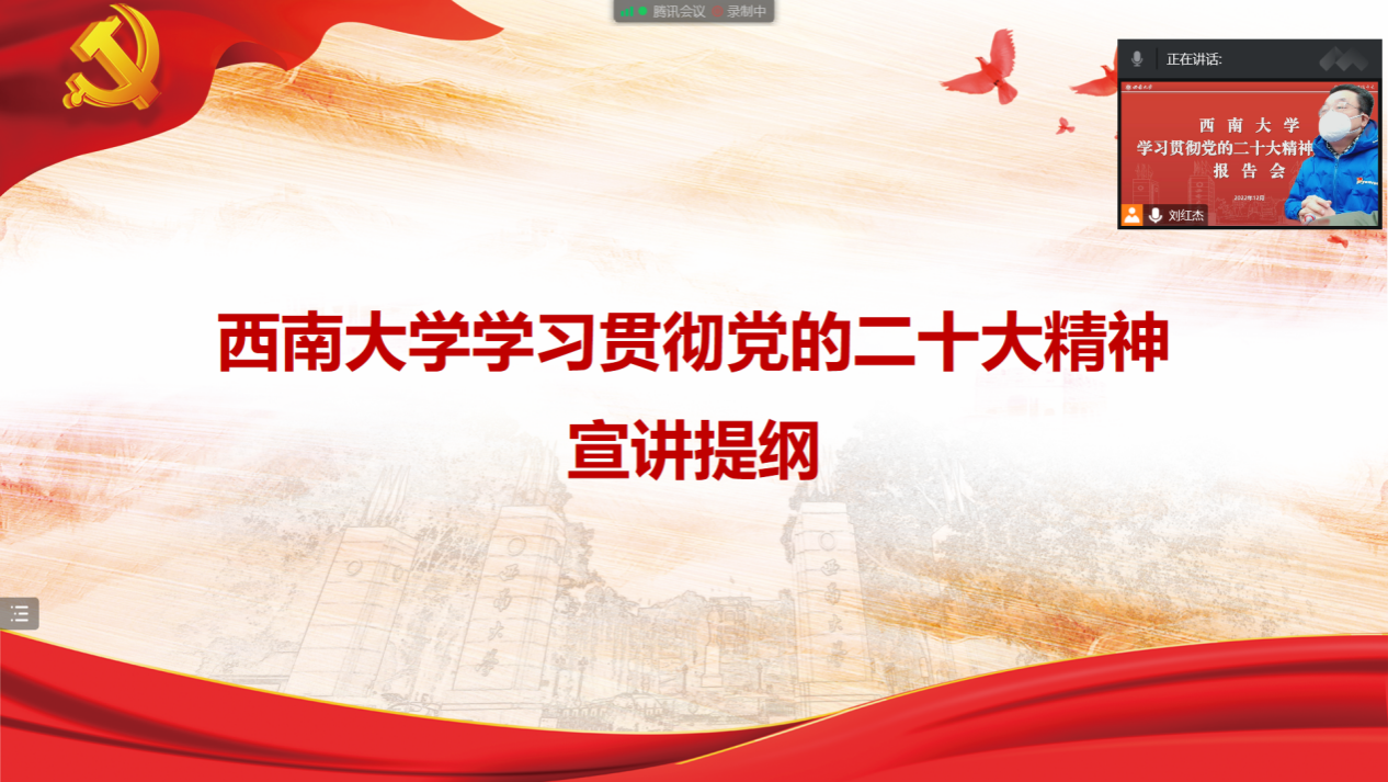 吴江在报告中围绕党的二十大的主题和主要成果、过去5年的工作和新时代10年的伟大变革、开辟马克思主义中国化时代化新境界、以中国式现代化全面推进中华民族伟大复兴、全面建设社会主义现代化国家的目标任务、坚持党的全面领导和全面从严治党、以斗争精神应对风险挑战等七个方面进行了宣讲解读,并结合学院工作实际,对学习宣传贯彻党的二十大精神提出了要求。