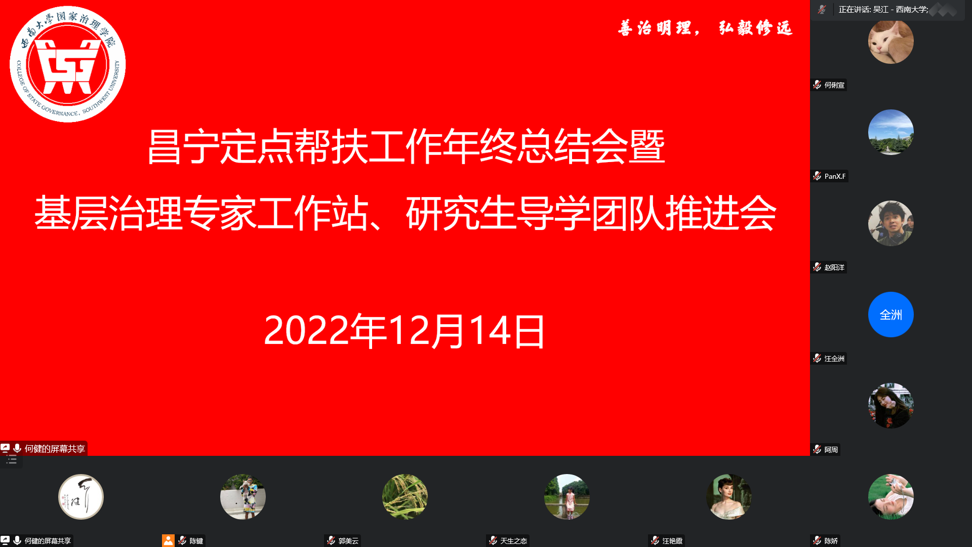 各位领导对几位同学在昌宁的辛勤工作给予高度评价。学院将认真听取同学们的帮扶工作建议,并将进一步深化院地合作,依托“基层治理专家工作站”,优化合作和帮扶机制,积极整合专家和员工志愿者力量,协助推动昌宁基层治理体系和能力建设再上新台阶。