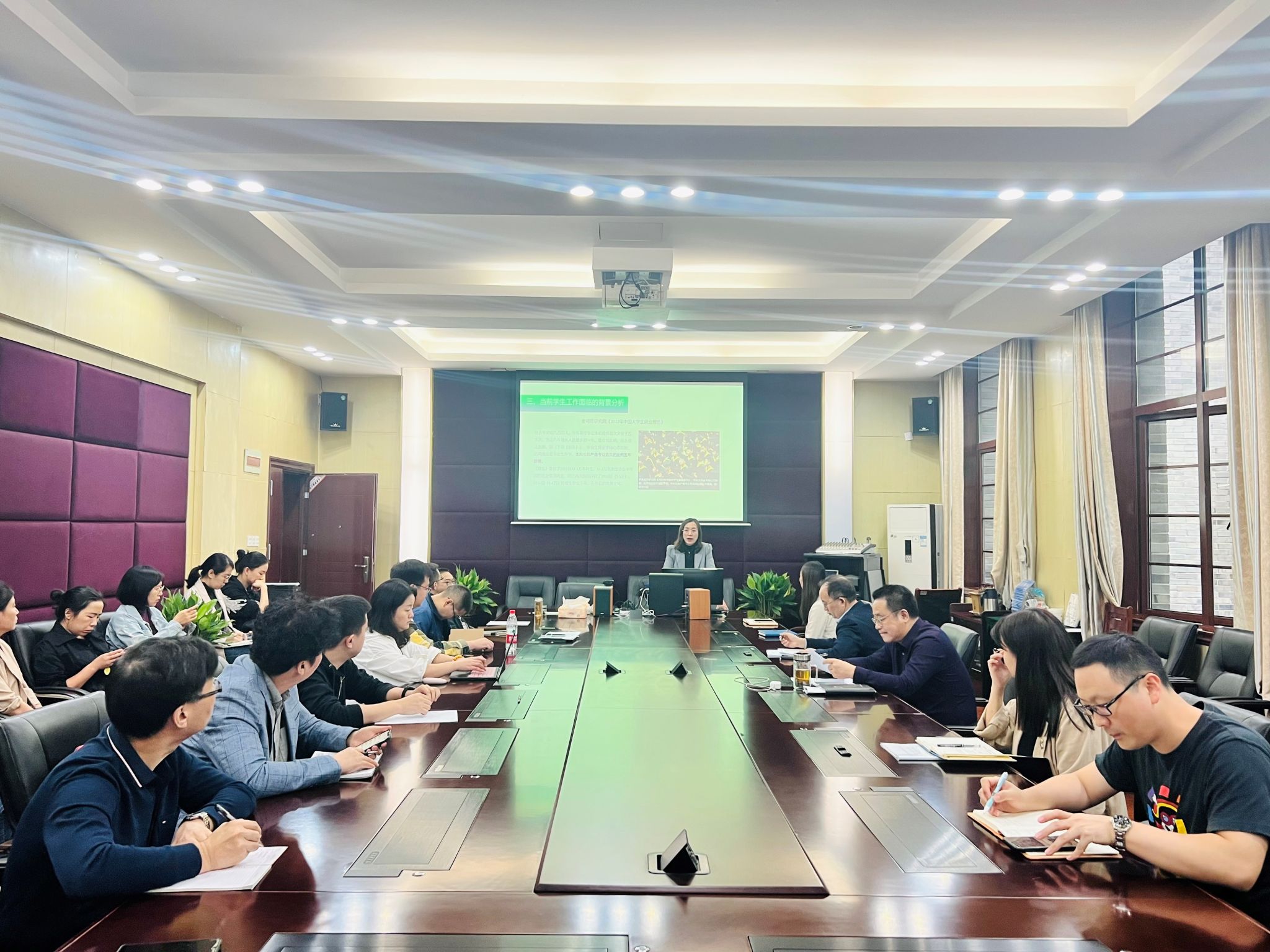 工作会中,王晖老师盘点了上一学年员工工作在思想政治教育、社会技能拓展、成长成才服务、心理安全建设、审美涵育等方面的成绩,肯定并感谢了班主任和辅导员的辛勤付出。王晖老师重点结合目前严峻的就业形势和21届员工就业去向,强调员工工作应聚焦于学业生涯指导、行为规范塑造、社会技能训练、就业资源链接、班级氛围养成等方面,为员工成长成才赋能助力。