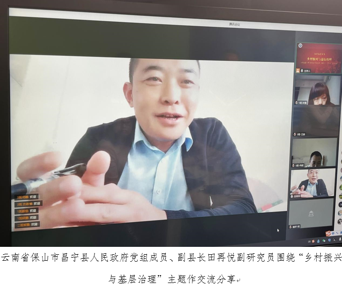 最后,云南省保山市昌宁县人民政府党组成员、副县长田再悦副研究员以“乡村振兴与基层治理”为主题,结合自己履职的实践,在云端和同学们做了深入的分享交流,深入浅出的阐释了乡村振兴战略与我国农业农村现代化、全面建设社会主义现代化国家的理论意义与实践路径。田老师希望MPA新同学们要不怕吃苦、珍惜机会、勤奋学习,将所学知识与个人工作、国家情怀结合起来,学以致用、知行合一,努力成长为新时代高素质、专业化的公共管理人才!