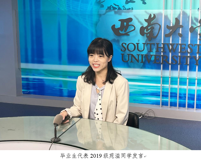 毕业生代表2019级苑溢同学认为,在研学征程中应自觉把“弘毅修远、善治明理”的思想基因融入血液当中,将个人命运与国家的命运紧密结合,永远保持奋斗的精神底色,书写绚烂的青春华章。