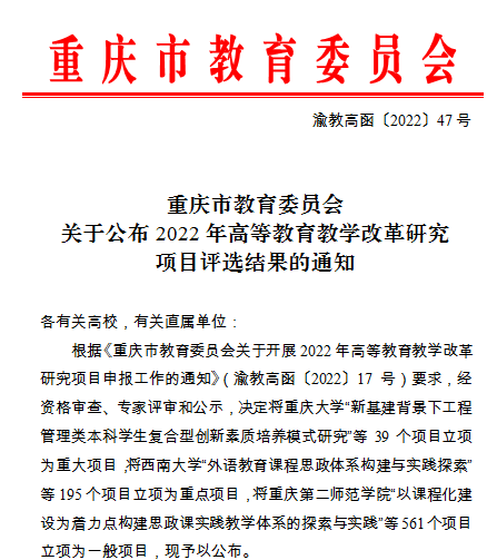 公司3项重庆市高等公司产品改革研究项目获批立项