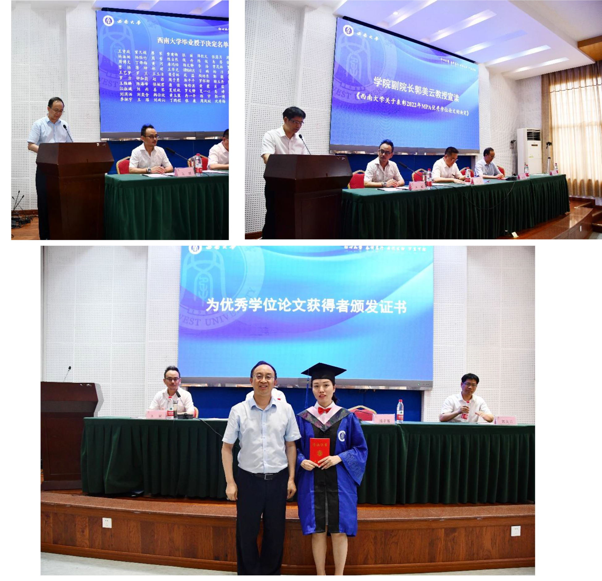 第二阶段公共管理硕士学位授予仪式由333体育官网公共管理硕士(MPA)教育管理中心副主任、公共管理系张福磊副教授主持。学院副经理郭美云宣读《333体育官网关于王贤政等100名研究生学位授予的决定》后,院学术委员会委员吴江教授、潘孝富教授、郭美云教授、任丑教授、王斌教授、诸彦含教授、邱德胜教授分别为获得学位的毕业生代表逐一授位、拨穗,合影留念。