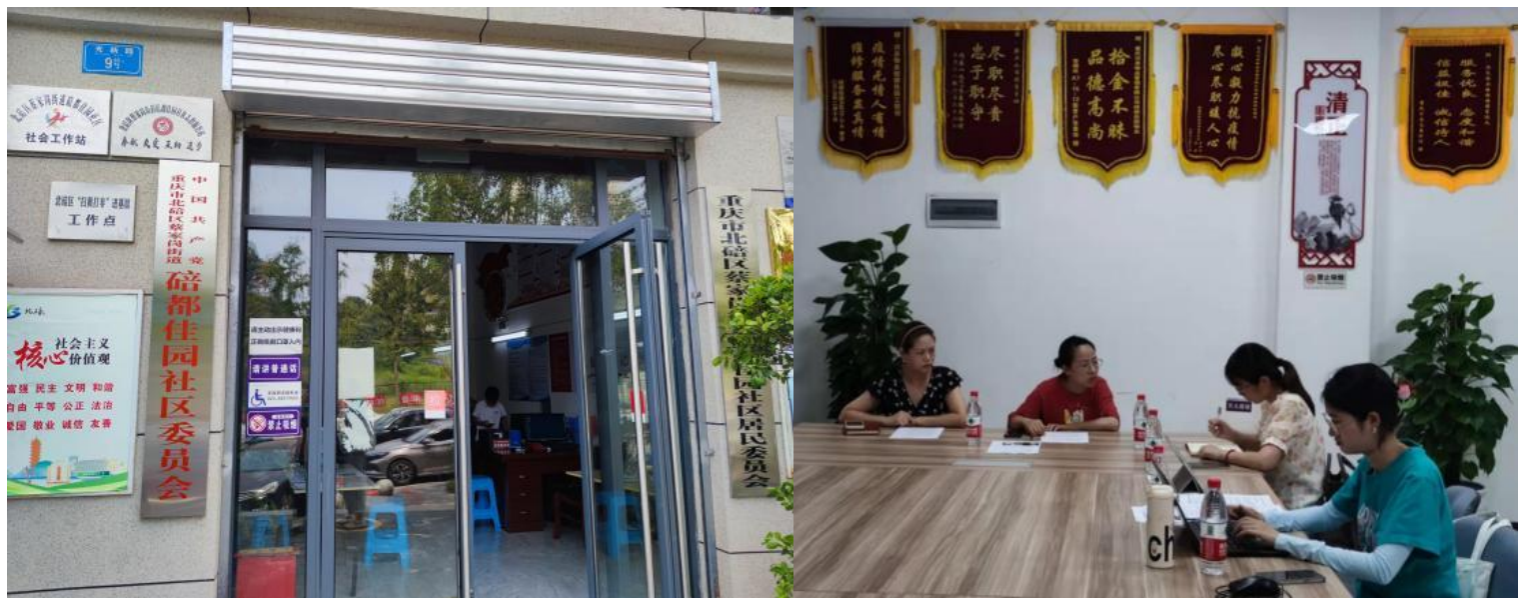 随后,调研团队走访两江名居、碚都佳园社区,实地访谈社区工作人员、察看社区党群服务中心和社会支持中心,对“五联一统”社区治理与服务新机制的运行、社区党建工作制度、监督机制、场地建设等情况进一步了解。