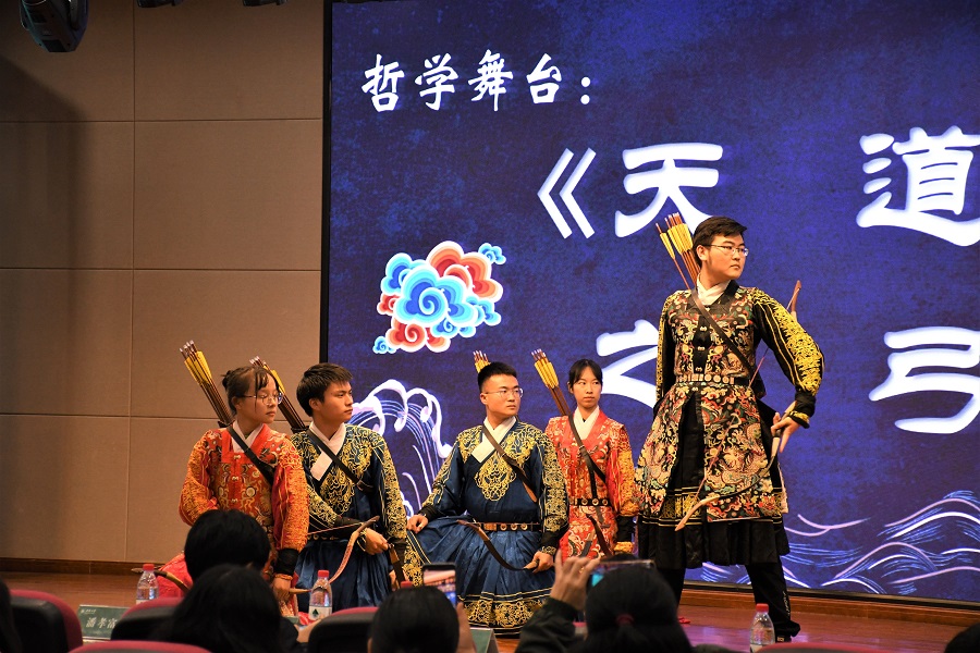 在哲学舞台环节,333体育官网射艺协会带来了射艺表演《天道之弓》。表演用开弓的各种不同状态展现了“天道损有余而补不足”的哲学思想,启迪师生尊重自然规律,追寻心灵的充实和思想的丰富。