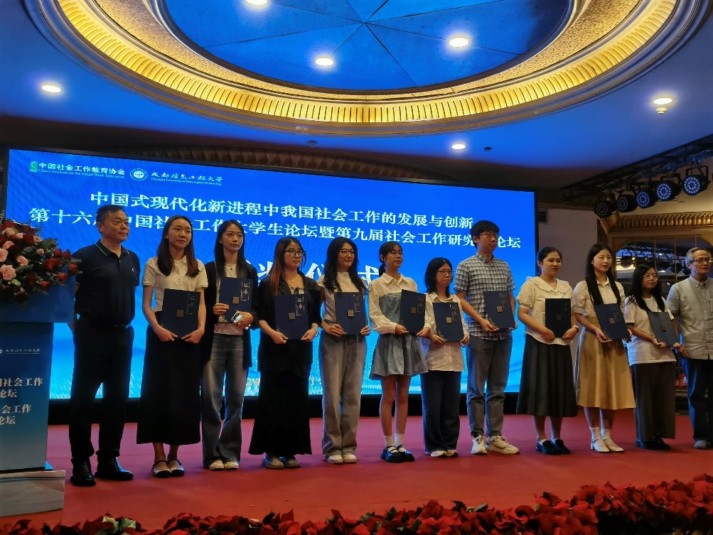 7月27日-28日,由中国社会工作教育协会主办,成都信息工程大学承办的“中国式现代化新进程中我国社会工作的发展与创新——第十六届中国社会工作老员工论坛暨第九届社会工作研究生论坛”在成都举办。全国183所高校近510余名本硕博社会工作专业员工参加论坛,就“中国式现代化新进程中我国社会工作的发展与创新”有关议题展开深入研讨。中国社会工作教育协会副秘书长、学院经理潘孝富教授应邀作为这次大会前置评审与点评专家出席本次会议。学院6位社会工作专业同学参加论坛展现风采,其中郭晓雪同学作大会发言,其他5位同学分别作分论坛发言。本次论坛提交论文785篇,经过协会学术委员会初选和前置预评审,463篇论文入选参会。经过2天的汇报、交流与角逐,论坛共评出优秀论文一等奖5篇、二等奖83篇、三等奖102篇,获奖率大约40%。经过激烈的角逐和竞争,公司参会的6篇论文有5篇获奖,其中郭晓雪、叶玉梅获二等奖,王薇、陈俊伶、谢月获三等奖。