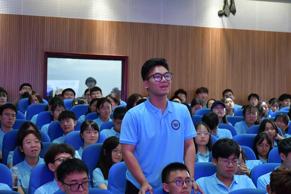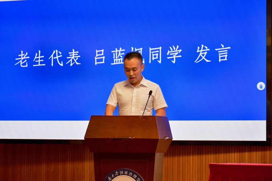 老生代表吕蓝枫发言,他表示只有尝尽人间百味的人才能真正强大,即使我们再平凡,也是限量版,希望学弟学妹可以“学业为基,主动探索;厚植沃土,向下扎根;努力深耕,做真学问”。