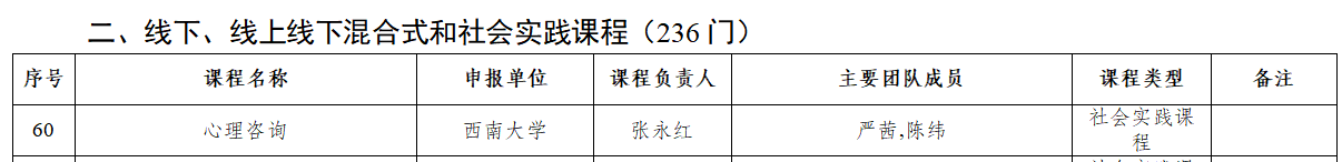 10月31日,重庆市教育委员会发布《关于公布2024年重庆市高校一流本科课程名单的通知》,学院《心理咨询》课程被认定为重庆市高校一流本科课程社会实践课程。