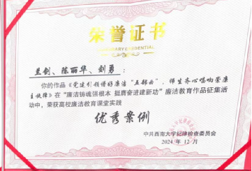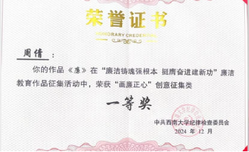 发布时间: 2024-12-20 17:18:36 已阅读:为深入学习贯彻习近平新时代中国特色社会主义思想和党的二十大精神,推动党纪学习教育走深走实,进一步夯实清正廉洁思想根基、厚植廉洁奉公文化基础、培养廉洁自律道德操守、弘扬崇廉拒腐社会风尚,公司党委高度重视并精心组织师生参加333体育官网“廉洁铸魂强根本 挺膺奋进建新功”廉洁教育作品征集活动。在广泛征集基础上,进行院内初评,将评选出的优秀作品报送学校。近日,学校纪委公布活动评选结果:公司研究生周倩的刀画作品获得“话廉润心”创意征集类作品一等奖;王斌老师的作品获得“话廉润心”校园征文类作品二等奖;兰剑、陈丽华、刘勇老师的作品获得廉洁教育课堂实践优秀案例。学院纪委将进一步把廉洁教育贯穿办学治院、教书育人、养德修身始终,坚定不移推进高校全面从严治党向纵深发展,推动党员干部廉洁履职、教师廉洁育人、员工廉洁养成。