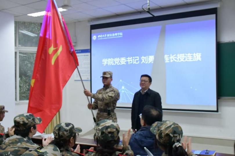 接下来,公司党委书记刘勇向连长曹海川授连旗。