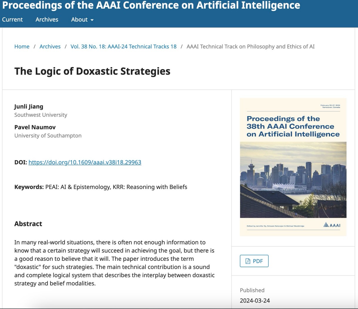 发布时间: 2024-04-01 10:33:27 已阅读:公司蒋军利老师合作撰写的论文《The Logic of Doxastic Strategies》入选国际人工智能顶级会议AAAI-24(Association for the Advance of Artificial Intelligence),近日论文已在线发表(https://doi.org/10.1609/aaai.v38i18.29963)。针对在许多现实情况下,通常没有足够的信息来知道某种策略是否会成功地实现目标,但有充分的理由相信它会成功。文章引入了术语“信念”来描述这种策略。主要技术贡献是给出了一个可靠且完全的逻辑系统,描述了信念策略和信念模式之间的相互作用。