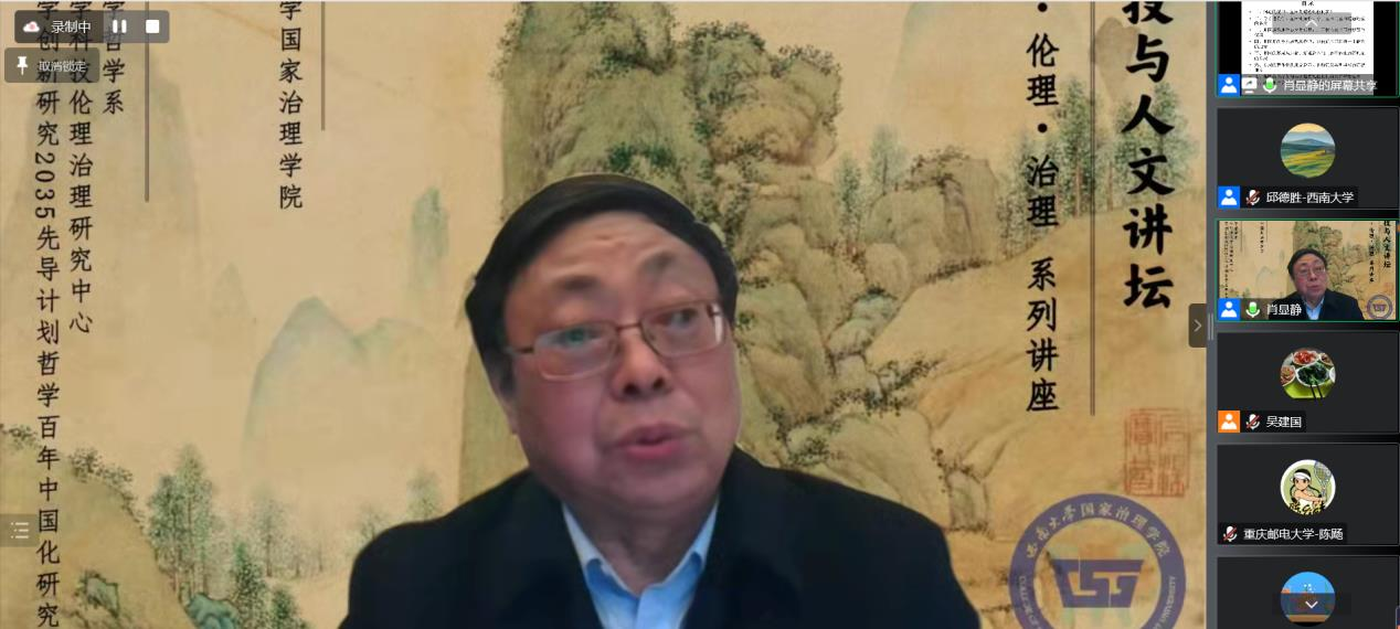 与谈环节中,吴建国表示本次讲座内容丰富、意蕴深刻,并对肖显静独到的观点、缜密的论证深表钦佩。吴建国还结合自己“生命哲学”的授课经历,谈了自身对基因和生命的认知,最终得出与肖显静殊途同归的结论,使大家获益良多。