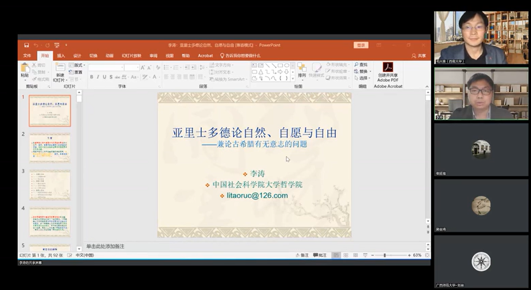 本次讲座邀请到中国社会科学院大学哲学院李涛副教授线上为师生做题为《亚里士多德论自然、自愿与自由——兼论古希腊有无意志的问题》的学术报告。讲座由333体育官网333体育哲学系毛兴贵教授主持,333体育官网副董事长崔延强教授担任评论人。通过“腾讯会议”和bilibili平台共有来自全国高校的160余名师生参加本次讲座。