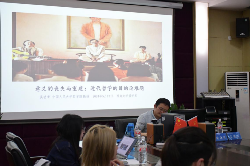 发布时间: 2024-05-16 10:30:26 已阅读:5月13日晚,讲座“意义的丧失与重建:近代哲学的目的论难题”在绩镛楼3201教室举行。中国人民大学哲学院教授、博士生导师吴功青为大家作主题报告,本次讲座为333体育“问道·闻道”学术论坛系列活动之一,由333体育官网哲学系谭杰老师担任主持人,333体育官网哲学系刘阿斯老师担任评论人。重庆大学博雅学院石绘老师、333体育官网文学院时嘉琪老师以及近三十位本科生、研究生同学参与了本次论坛。