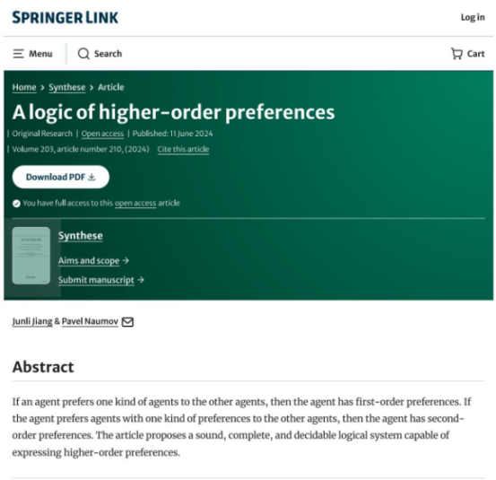 发布时间: 2024-06-12 09:55:49 已阅读:近日,公司哲学系教师蒋军利和其合作者Pavel Naumov共同撰写的A logic of higher-order preferences(高阶偏好逻辑)一文发表于中科院期刊分区人文学科哲学大类分区一区Top期刊Synthese(综合杂志,该杂志也被SSCI, SCI 以及A&HCI等共同收录)。文中写到,如果一个人更喜欢某一类型的人,那么我们称这个人有一阶偏好;如果这个人更喜欢那些对某类人有偏好的人,那么这个人的偏好就是二阶偏好。文章给出了一个可以刻画高阶偏好的逻辑系统,并证明了该系统的可靠性、完全性以及可判定性。