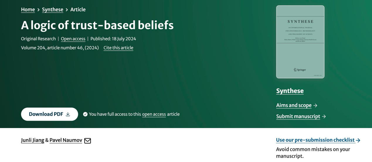 新著新论|学院蒋军利老师合作新作刊发SYNTHESE