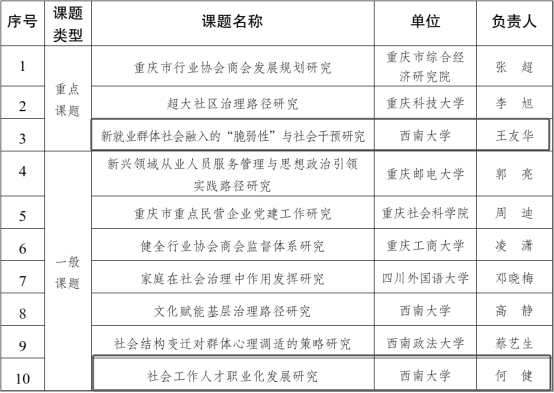 重庆市社会工作高质量发展专项研究课题,是服务全市社会工作领域发展的重要专项课题,为重庆社会工作高质量发展提供决策参考。此次推荐立项中,王友华老师主持的《新就业群体社会融入的"脆弱性"与社会干预研究》获批重点课题;何健老师主持的《社会工作人才职业化发展研究》获批一般课题。