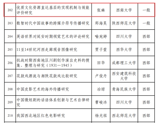 发布时间: 2025-09-03 16:55:53 已阅读:8月18日,文化和旅游部科技教育司、全国艺术科学规划领导小组办公室公布了2025年国家社科基金艺术学年度项目立项公示名单,公司张琳副教授主持的《优质文化资源直达基层的实现机制与效能评价研究》项目成功获批国家社科基金艺术学一般项目立项。