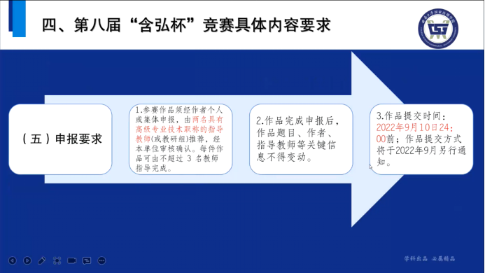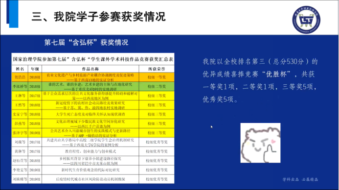 最后,主讲人从竞赛时间、竞赛对象、申报范围、申报类别及申报要求五个方面详细地说明了第八届“含弘杯”员工课外学术科技作品竞赛的具体内容要求,强调公司同学可以重点关注哲学社会科学类这一申报类别,并附上第十七届“挑战杯”全国老员工课外学术科技作品竞赛中部分哲学社会科学类获奖作品选题,供同学们参考借鉴。