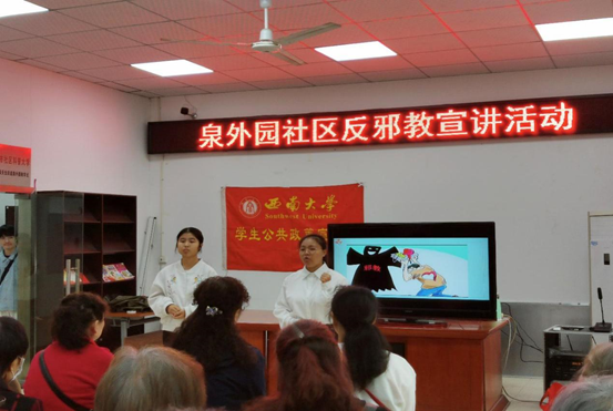 首先,公宣团的宣讲员黎诗蔚和王东海向爷爷奶奶们讲解了如何辨别邪教以及分清宗教与邪教的本质区别,现场的观众们无不聚精会神,认真学习。紧接着,宣讲员卢昕与刘思雨讲述了许多曾经发生过的真实案例,通过真实的事件让爷爷奶奶们充分了解到邪教的危害,树立反邪教意识,切实增强了爷爷奶奶们抵御邪教侵蚀的能力。