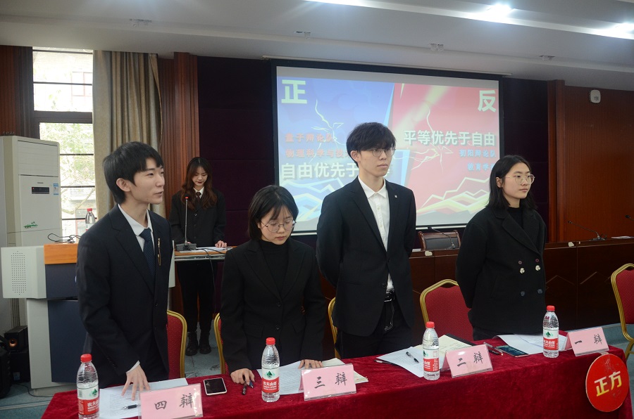 发布时间: 2020-12-18 12:10:32 已阅读:辩论赛不仅可以锻炼员工的思维、语言表达、团队协作等能力,还可以营造良好的学习氛围。“哲学月爱智杯”系列辩论赛始终致力于为全校师生提供一个展现辩论才能的平台,推进哲学走进生活、走进大众的进程,让更多的同学乐于了解、学习哲学。12月17日下午,“哲学月爱智杯”辩论赛决赛于3教3326教室正式举行。公司物理科学与技术学院量子辩论队持正方观点“自由优先于平等”与持反方观点“平等优先于自由”的教育学部初阳辩论队进行了激烈论战。