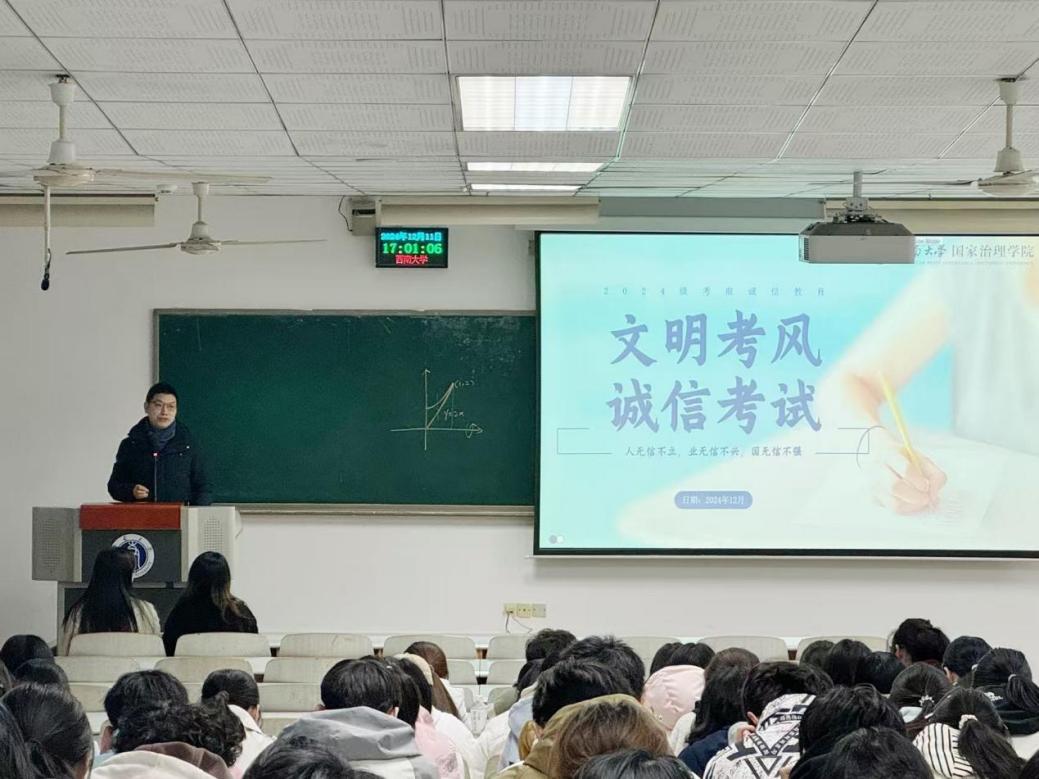 发布时间: 2024-12-13 08:54:36 已阅读:为加强本科新生对诚信考试的认识,营造良好学习氛围,12月11日,2024级本科生在10教501教室开展了“文明考风,诚信考试”主题教育活动。公司副经理张永红、辅导员肖颜、兼职辅导员龙小燕和2024级全体本科生参加活动。活动由肖颜老师主持。