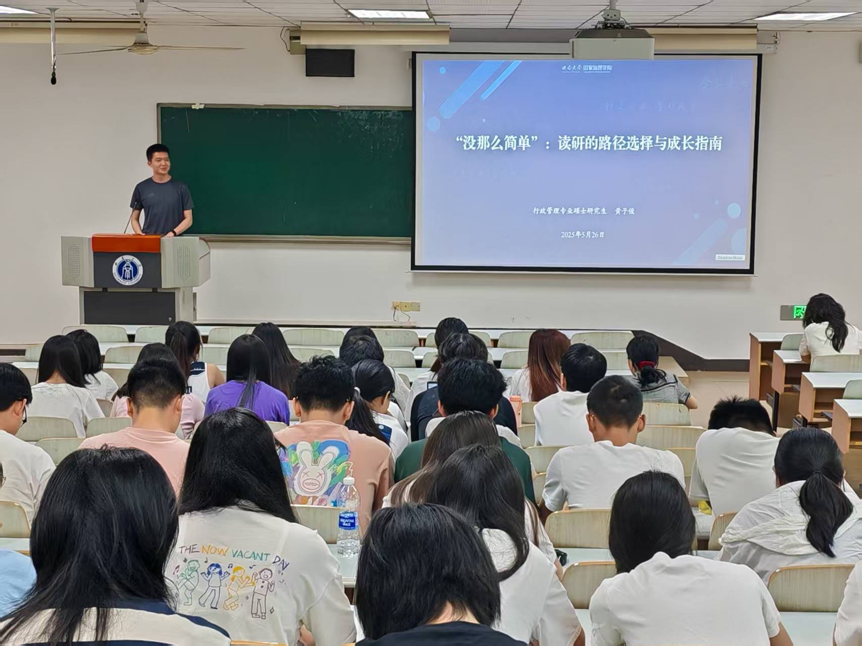 第二位分享的优秀学子是2022级行政管理专业硕士研究生黄子俊,他以“没那么简单:读研的路径选择与成长指南”为主题进行交流。他毫无保留地向学弟学妹们分享了读研择校的宝贵经验,深入剖析了针对不同读研动机应如何规划读研路径。同时,黄子俊还结合自身实际情况分享了读研期间的学习与生活感悟,提醒同学们要注重培养良好的时间管理能力和自主规划能力。