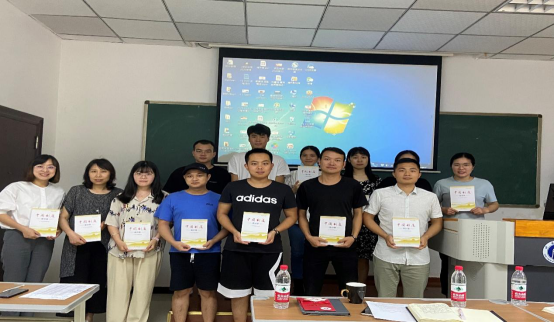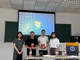 (图为龙艺老师和王晖老师为支部同志赠送政治生日贺卡)