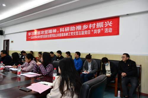 发布时间: 2021-10-31 15:31:58 已阅读:为深入学习贯彻习近平总书记在全国脱贫攻坚总结表彰大会上的重要讲话精神,3月12日下午,学院公管系教工党支部同社科处党支部在学院3328会议室开展了“学习脱贫攻坚精神 科研助推乡村振兴”主题党日“共学”活动。